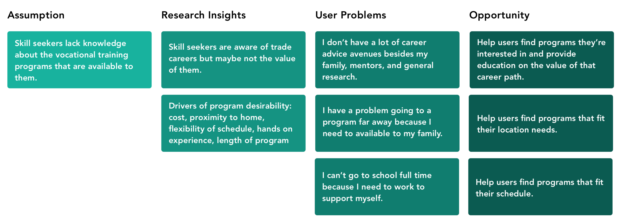 Meritize reached skill-seekers in the final two phases of their journey to starting a vocational training program. After weeks of research, we saw an opportunity for Meritize to begin interacting with skill-seekers earlier in their journey which we believed would lead to several user and business outcomes: